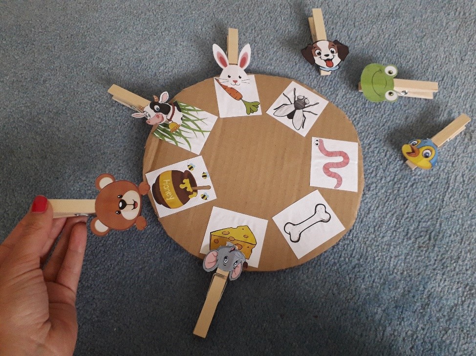 OPIS AKTIVNOSTI: od kartona izrežite krug te na rubove zalijepite sličice hrane za životinje, a na kvačice zalijepite sličice životinja. Dijete treba zakvačiti kvačicu na točnu sličicu hrane kojom se zadana životinja hrani.