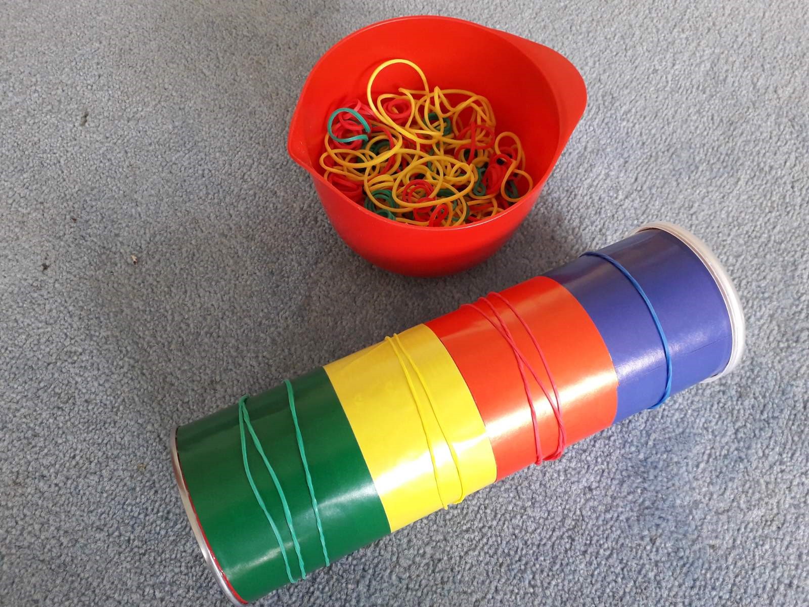 OPIS AKTIVNOSTI: tubu obojati željenim bojama ili zalijepiti kolaž papir te na nju nizati gumice istih boja. Poticati dijete da imenuje boje, a možete i zadati određeni redosljed boja koje dijete treba pratiti čime dijete razvija auditivnu i vizualnu pažnju te praćenje naloga.