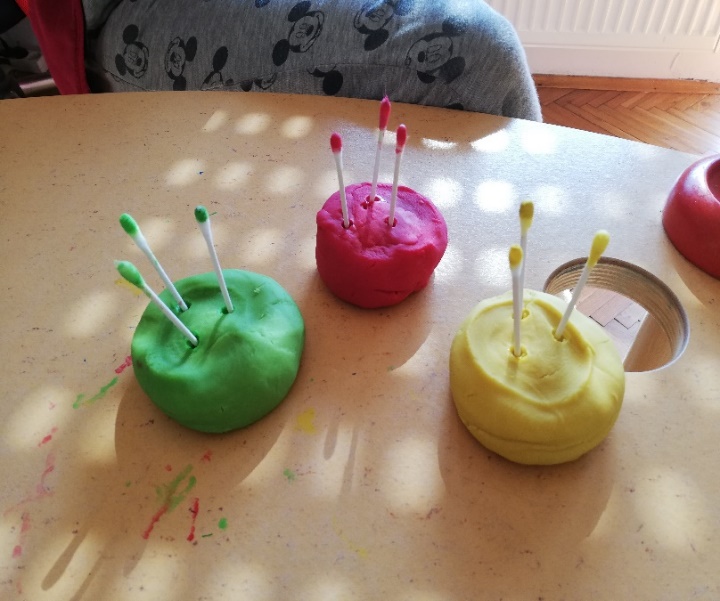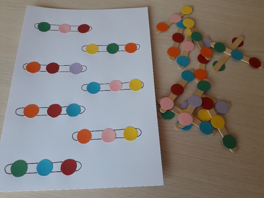 OPIS AKTIVNOSTI: na kolaž papir iscrtajte pa izrežite kružiće te ih zalijepite na štapiće ( po tri, u raznim kombinacijama). Na običnom papiru iscrtajte kombinacije kao i na štapićima te tražite dijete da ih upari. Umjesto rezanja, kružiće možete i nacrtati na štapiće.