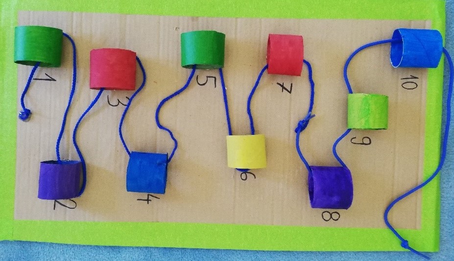 OPIS AKTIVNOSTI: tuljac wc papira prerežite na pola te ih obojajte u boje po izboru. Uzmite karton, zalijepite obojane tuljce rasporedom prilagođenom djetetu ( jednostavniji ili teži slijed). Pokraj svakog tuljca napišite broj kako bi dijete znalo kamo ići ( može i dijete sudjelovati u redanju brojeva). Špagu zalijepite na početak, pokraj prvog tuljca. Dijete treba provuči špagu kroz zadane tuljce, zadanim redom.
