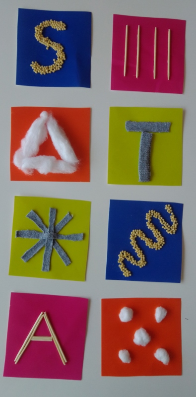 OPIS AKTIVNOSTI: napisati (ili još bolje napraviti od materijala raznih tekstura koje će dijete moći opipati i osjetiti razliku) na papiriće slova i nacrtati razne oblike, odnosno „neslova“. Dijete treba odrediti nalazi li se na papiriću slovo ili „neslovo“. Odvajajte slova od ostalih znakova. Za svako slovo može se provesti aktivnost glasovne analize i sinteze, ovisno o mogućnostima djeteta. Npr. Ovo je slovo A – znaš li neku riječ kojom počinje glasom A? (pišemo slova, izgovaramo glasove) Dijete odgovori npr. auto – na kojem mjestu u riječi auto se nalazi glas u? Brojimo s djetetom slova ukoliko dijete ne može samo odrediti. Koji glas se nalazi na trećem mjestu u riječi auto? Slovkamo riječ a-u-t-o i brojimo na prste kako bismo saznali koji se to glas nalazi na trećem mjestu.